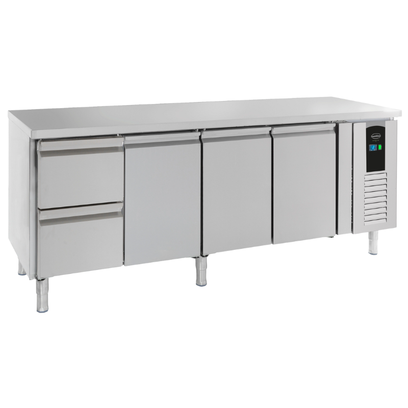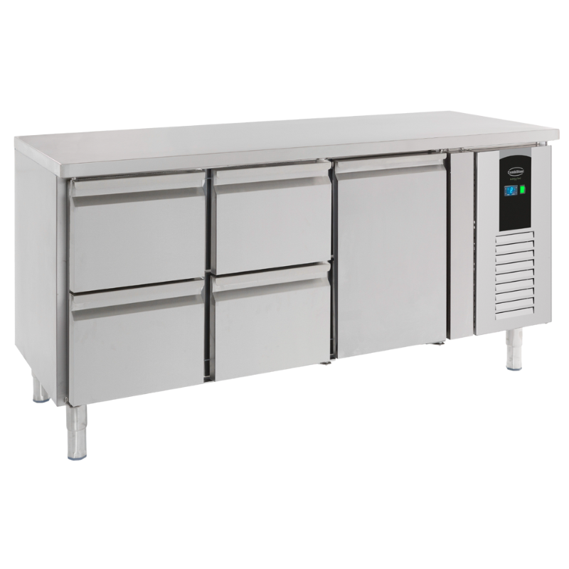 The four GN 1/1 format drawers offer easy organization of products, facilitating access and stock management. Each drawer is designed to meet the demands of professional kitchens, with high load capacity and smooth handling. The included backsplash protects the wall against splashes and debris, thus reducing the time spent on cleaning.
