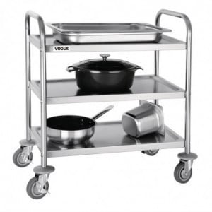 Ideaalne toitlustusspetsialistidele, see 3-tasandiline koristuskäru Vogue roostevabast terasest sisaldab kolme tugevat riiulit määrdunud nõude, taldrikute, kandikute ja muude lauanõude hoidmiseks. Kuna see on valmistatud roostevabast terasest, on seda pärast iga kasutuskorda äärmiselt lihtne puhastada. See on disainitud kolme tugeva riiuliga, mida saab kasutada määrdunud nõude, taldrikute ja muude lauanõude transportimiseks. Selle pikkus on 710 mm, sügavus 405 mm ja kõrgus 825 mm. See on varustatud nelja vaikse rattaga ja kahe piduriga ning aluse mõõtmed on L 686 x P 380 x H 32mm.