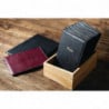 Traditsioonilise stiiliga polsterdatud menüükaas PVC kattega, mis on kergesti puhastatav, saadaval A4 või A5 formaadis. Kahepoolne esitlus. Lisalehed ja dekoratiivne kuldne nöör müüakse eraldi (lehed E226 ja nöör E228). Menüükaarte ei ole kaasas.
