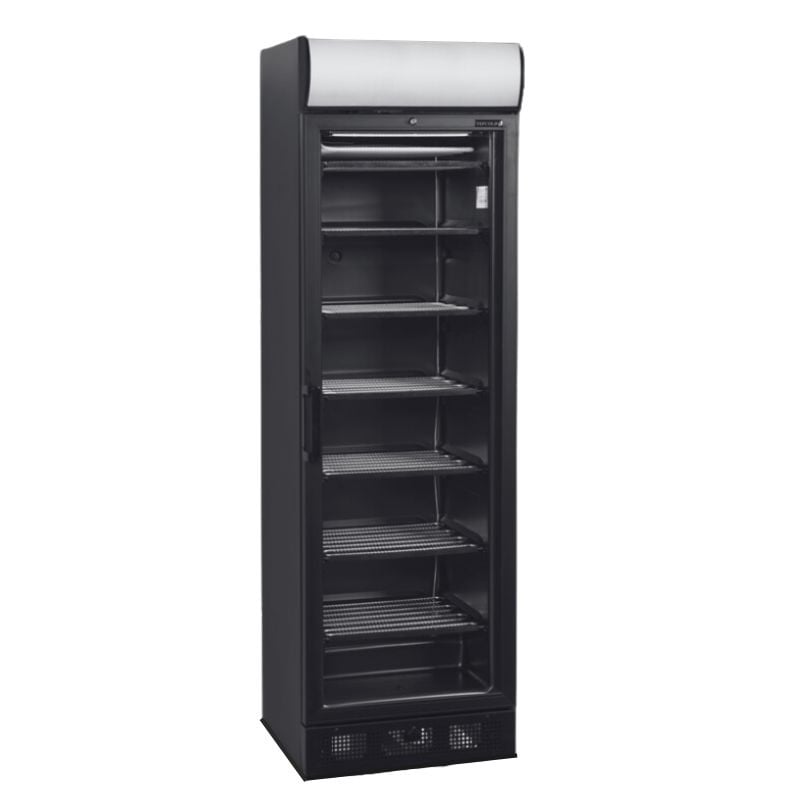 Avastage TEFCOLDi klaasuksega sügavkülmik varikatusega - Must - 270 L, mis on ideaalne valik köögiprofessionaalidele. Oma kvaliteetsete omadustega vastab see toode suurepäraselt teie vajadustele. Varustatud soojendatud klaasukse ja LED-sisevalgustusega, pakub see vitriin suurepärast esitlust teie külmutatud toodetele. Selle valgustatud korpus köidab teie klientide tähelepanu, aidates kaasa teie brändistrateegiale. Tänu oma staatilise külma süsteemile ja kuuele aurusti ahelat integreerivale fikseeritud riiulile on temperatuur kogu kapis ühtlane. Sulatusvee äravool hõlbustab ka selle vertikaalse sügavkülmiku hooldust.