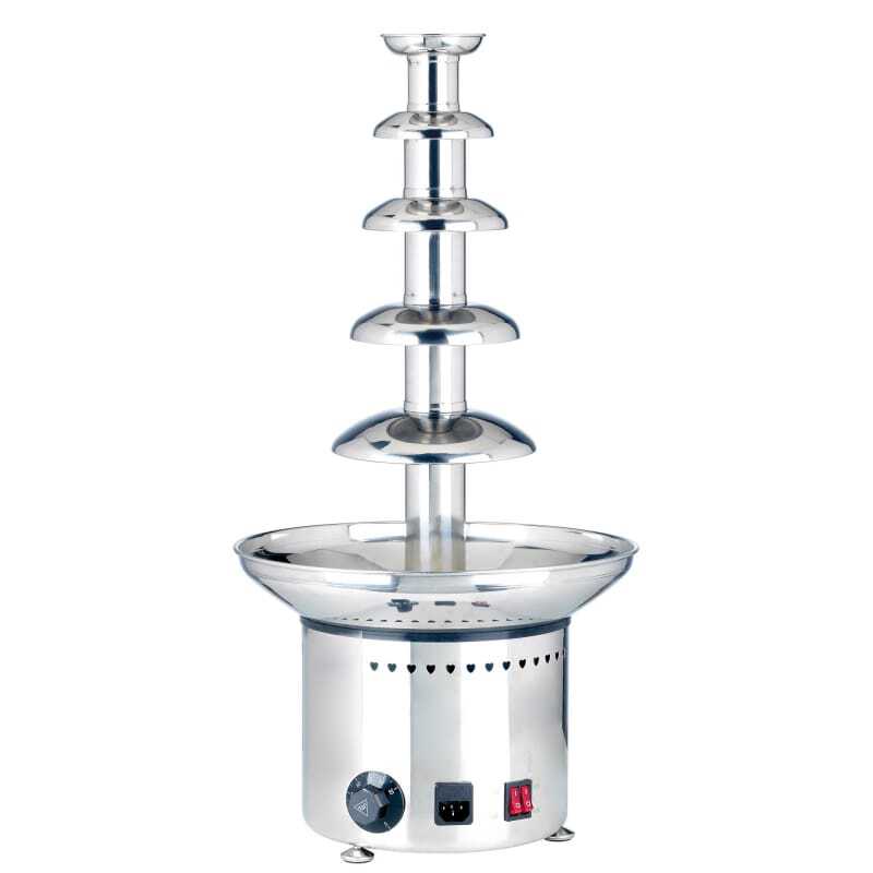 Dotée d'un bol de 330 mm de diamètre et de 5 cascades, cette fontaine à chocolat permet de satisfaire jusqu'à 120 convives. Elle est en acier inoxydable est équipée d'un puissant moteur et d'un bouton de réglage de la température pour un chocolat maintenu à la bonne température. Son design esthétique permet de s'intégrer à tout style de festivité et sa température est réglable de 0 à 110 °C .