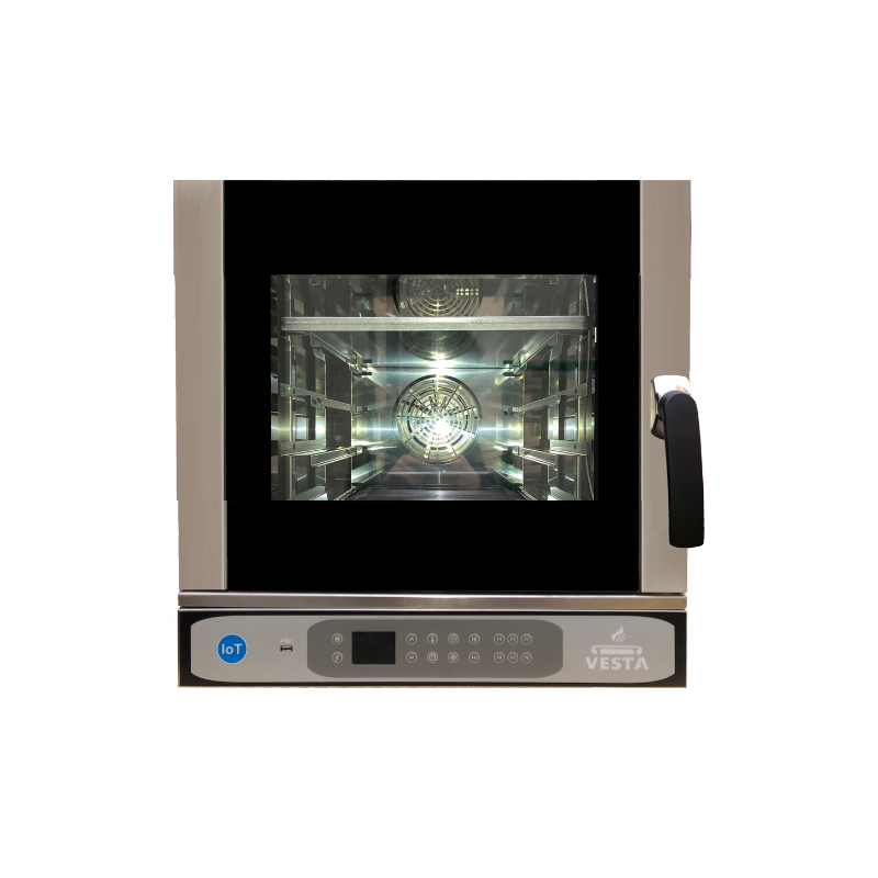 Ce four n'est pas seulement puissant, il est aussi économique et sécurisé. L’isolation de la chambre de cuisson garde la chaleur à l’intérieur, réduisant ainsi les dépenses énergétiques. La porte équipée d’un verrouillage de position et de charnières côté droit (avec possibilité de modification en usine) garantit une manipulation sûre et adaptative. De plus, l’éclairage intérieur LED vous permet de surveiller vos plats sans ouvrir la porte, conservant ainsi la température constante pour une cuisson parfaite.